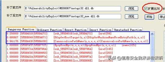 微软发布的MS08-067的补丁,该问题被列为严重。该安全更新解决了服务器服务中一个秘密报告的漏洞。如果用户在受影响的系统上收到特制的RPC请求,则该漏洞可能允许远程执行代码。漏洞挖掘过程为例说明补丁对比技术的应用。首先保留一份原始文件,然后安装新的补丁程序,提取出相同和新加入的文件后,就可以使用软件进行对比。